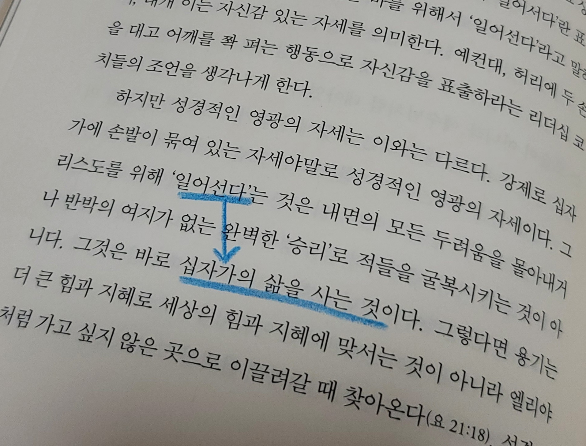 왜 저자는 용기를 말했을까 고민해보았다. 아마 그것은 성경에서 가장 많이 말하는 '두려워 하지 말라' 의 두려움의 반대가 되는게 용기가 되기때문이 아닐까 생각해본다. 두려움을 이기는 용기, 나의 걱정을 넘어선 나의 생각과 염려를 넘어선 용기. 그 용기는 예수그리스도의 죽음, 예수그리스도의 십자가를 통해서만 우리에게 주어진다.