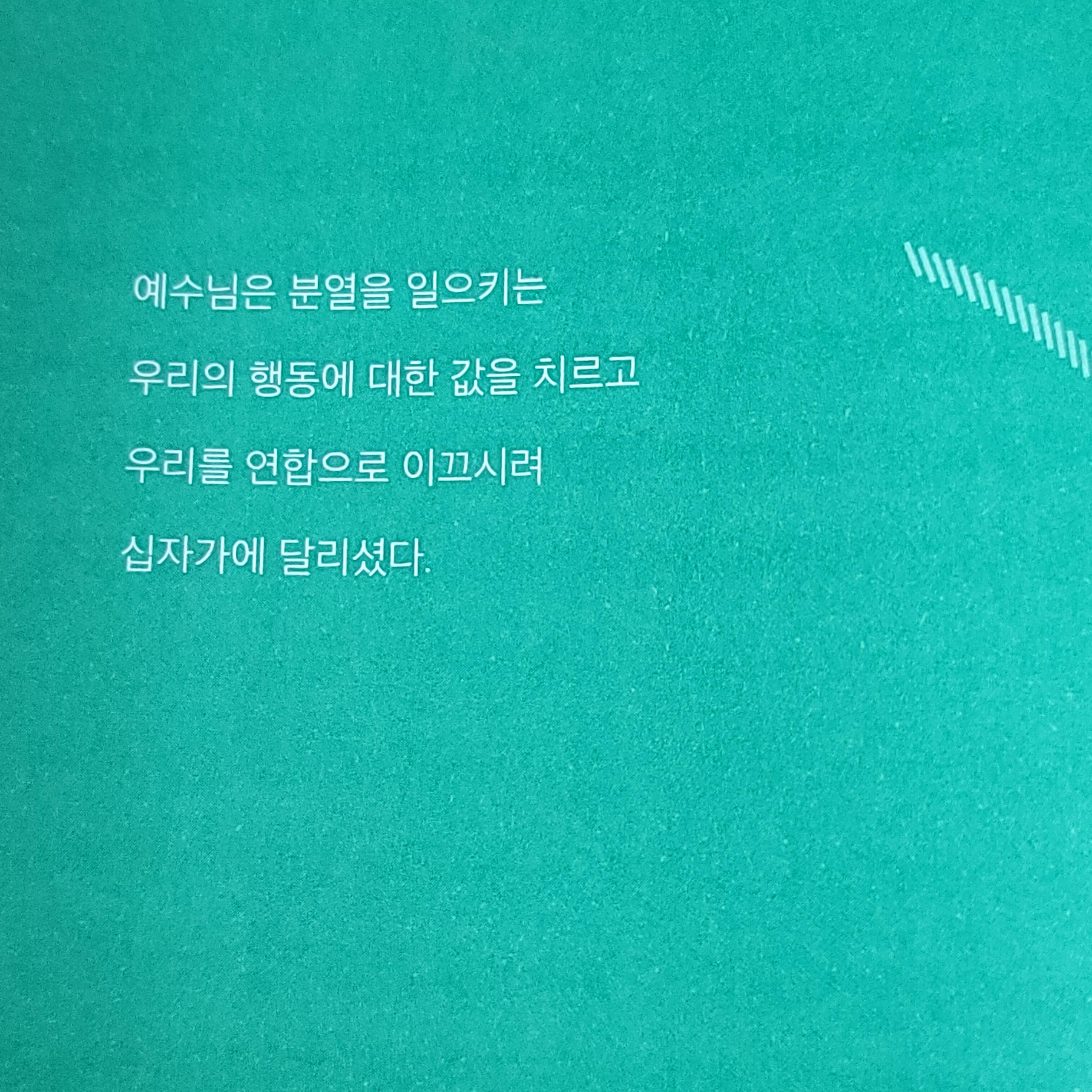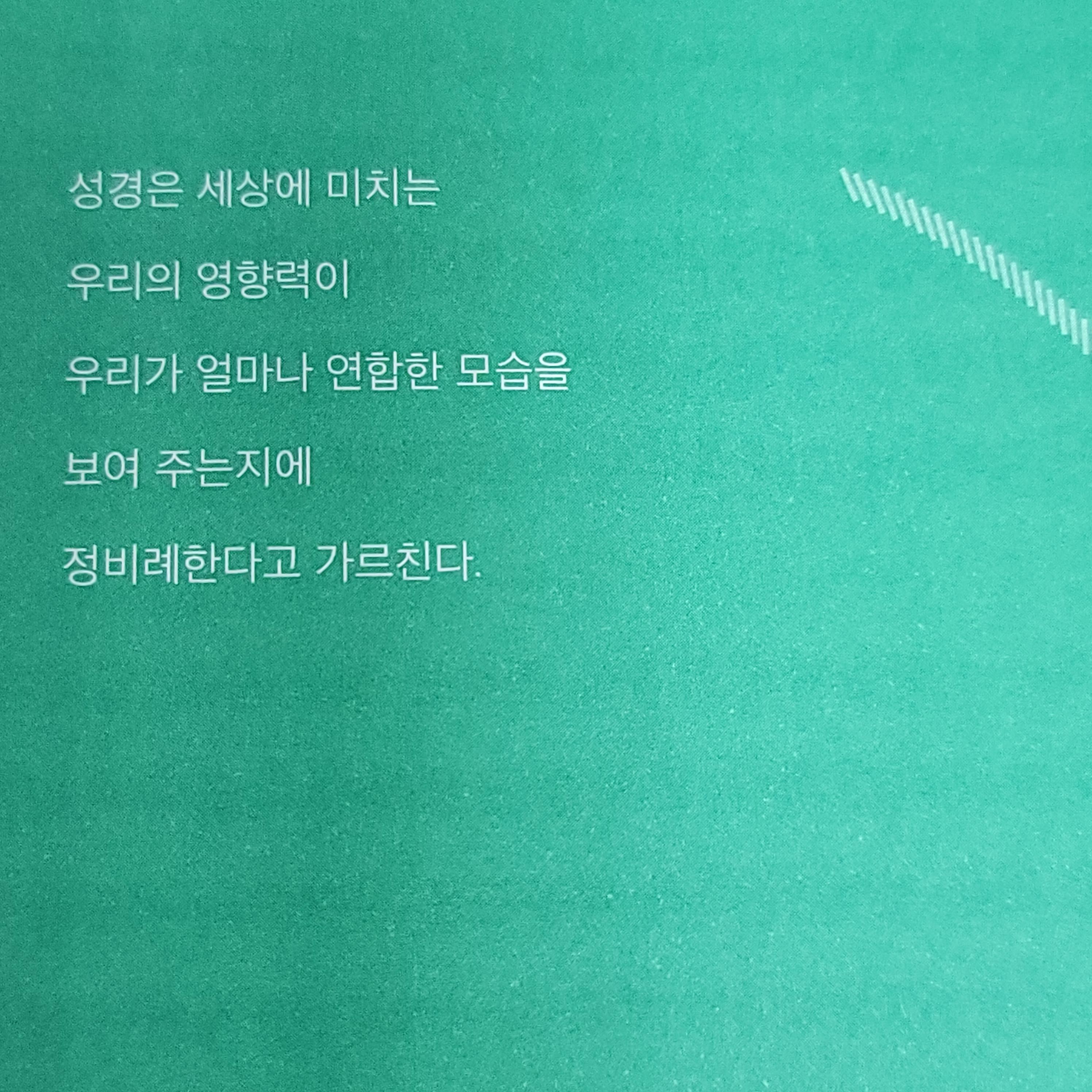 이 책은 연합에 대해 저자가 말하는 힘 있는 외침으로 이야기가 채워져있다. 우리의 습관적인 판단과 험담 비교들 속에 하나 되지 못하게 만드는 것들을 이제는 하나 됨을 꿈꾸며 나아가라고 저자는 말한다.