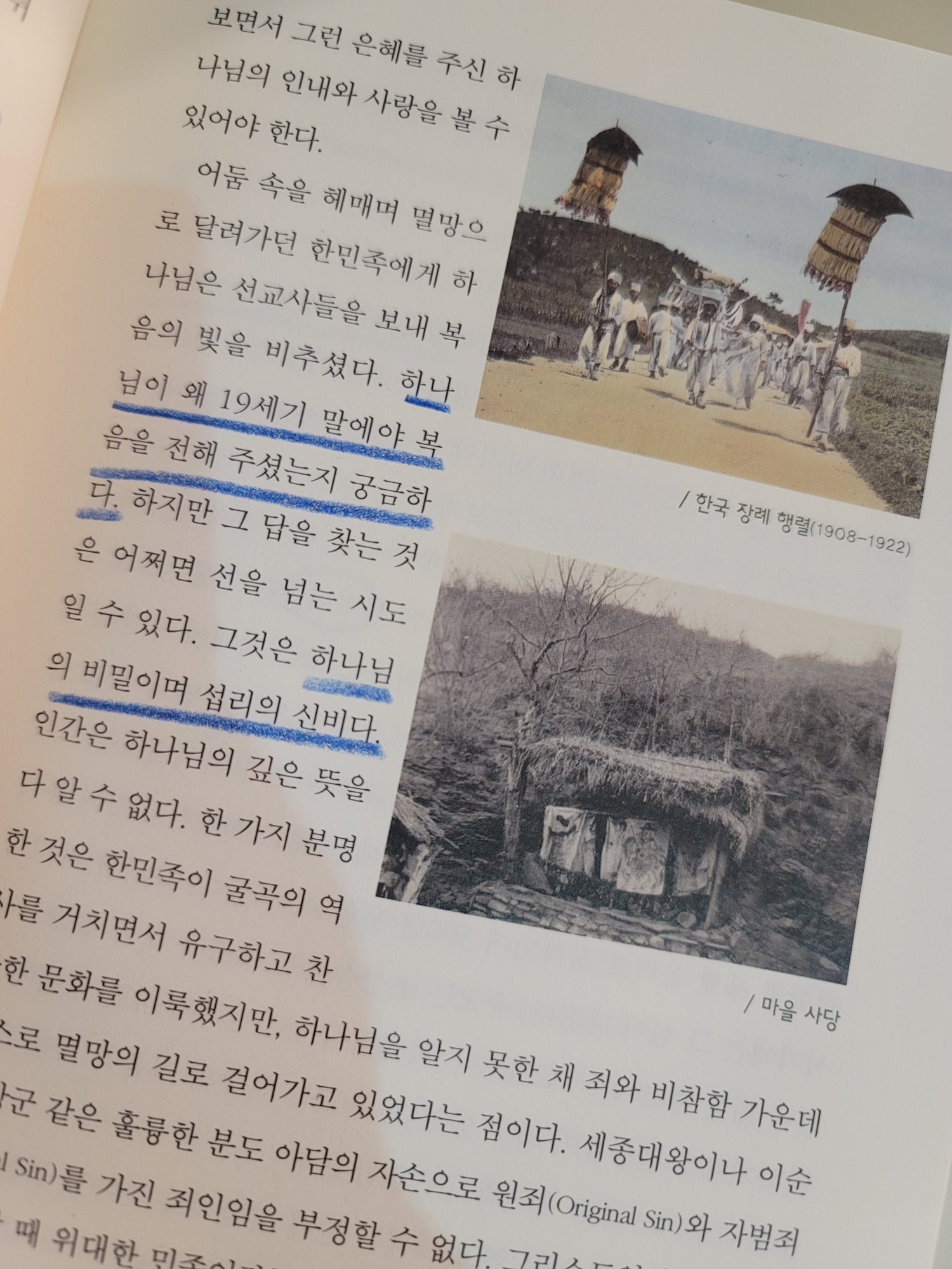 이 책이 매력적으로 다가오는 지점들 중 한가지는, 한국 교회사 파트 구분이다. 총 7개의 파트로 구성되어 있는 이 책은 구한말에 왜 교회를 주셨고, 위기의 조선 가운데 교회의 모습들, 한반도의 영적 대부흥, 일제강점기 교회들의 역할, 신사참배, 해방 후 교회의 모습, 마지막으로 주제로 보는 한국 교회 정리까지 로 한국 교회사를 구분하였다. 책 제목을 설명하는 '한민족에게 임하신 하나님의 손길을 따라' 산책하는 마음으로 한국 교회사를 돌아볼 수 있게 구성되어 있어서 저자의 한국 교회사를 바라보고 사랑하는 마음이 너무나도 잘 느껴졌다.