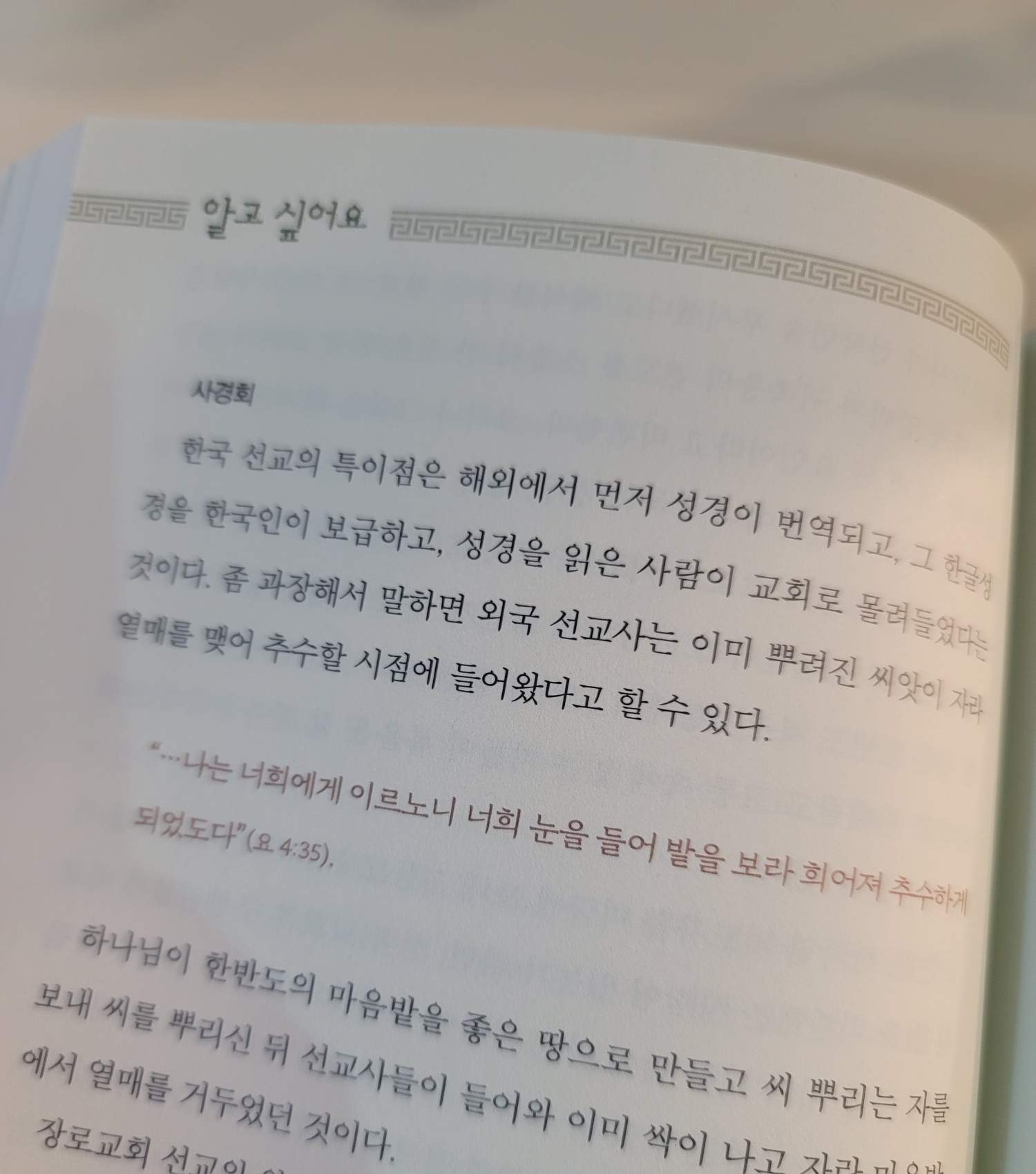 나는 개인적으로 선교를 준비하는 사역자로써 한국 교회사의 시작에 많은 관심이 있었는데, 기존에 흔히 우리가 알고있는 이야기들을 나열한 것에서 그친 것이 아니라 주제의 명확한 구분과 소제목들로 이어지는 한국 교회사 설명들을 통해 내가 모르는 많은 이야기들도 있었음을 다시 한번 발견하게 되었다.