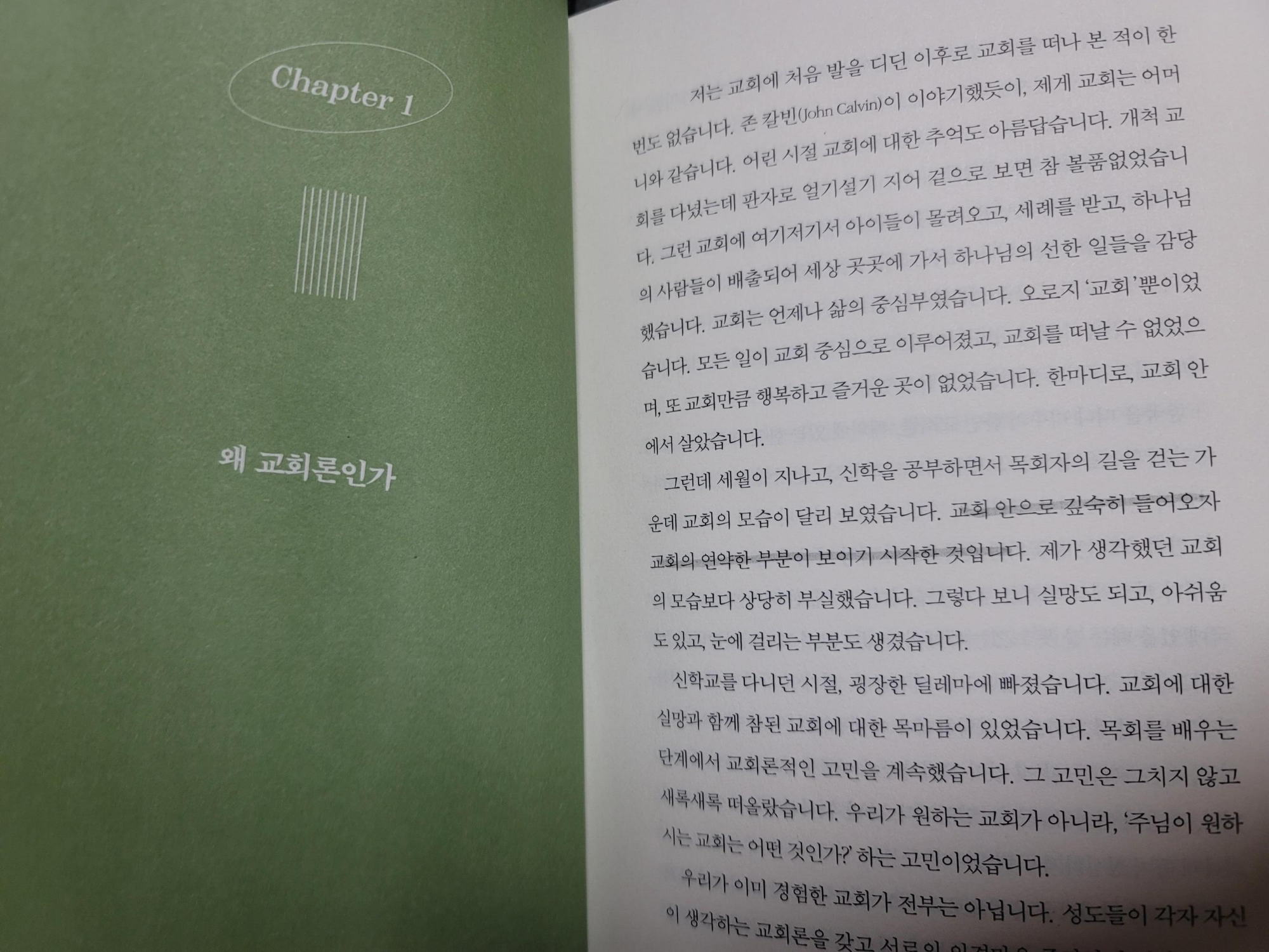 코로나를 겪으며 우리에게 교회란 도대체 뭔가? 뭐길래 이런 상황속에서도 예배해야할까? 하는 우리들에게 교회는 이렇습니다! 라고 고백하는 내용들이 책을 구성한다. 다섯개의 파트로 구성된 책은 교회를 진단하고, 교회의 본질을 설명하며, 교회의 존재이유, 건강한 교회론, 교회가 나아갈 방향으로 이뤄져있다. 각 챕터마다 흐름을 따라 읽어내려가면 교회를 이해하고, 왜 교회가 필요한지에 대한 질문에 명쾌한 답을 스스로 내릴 수 있을 것이라 생각한다.