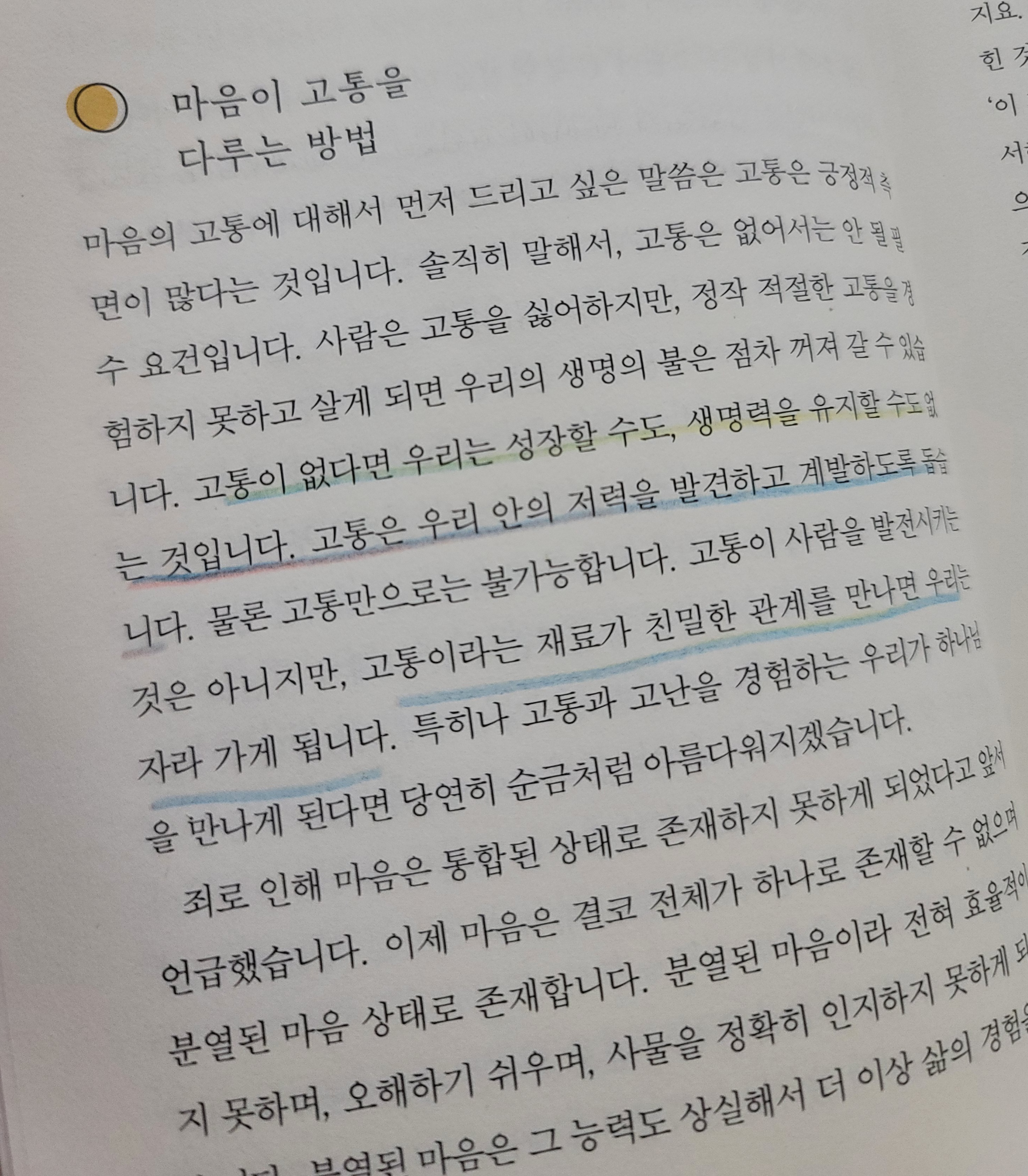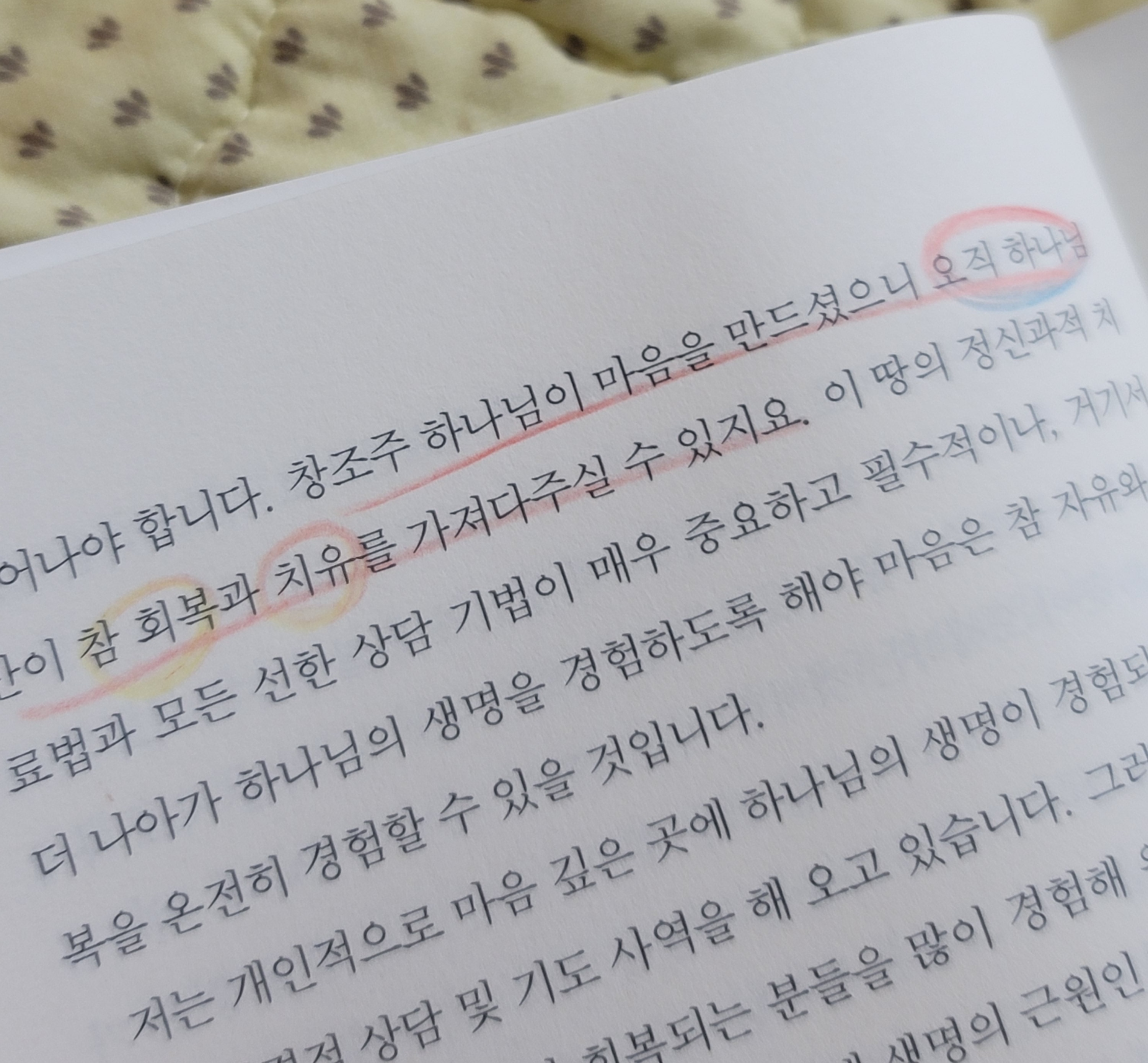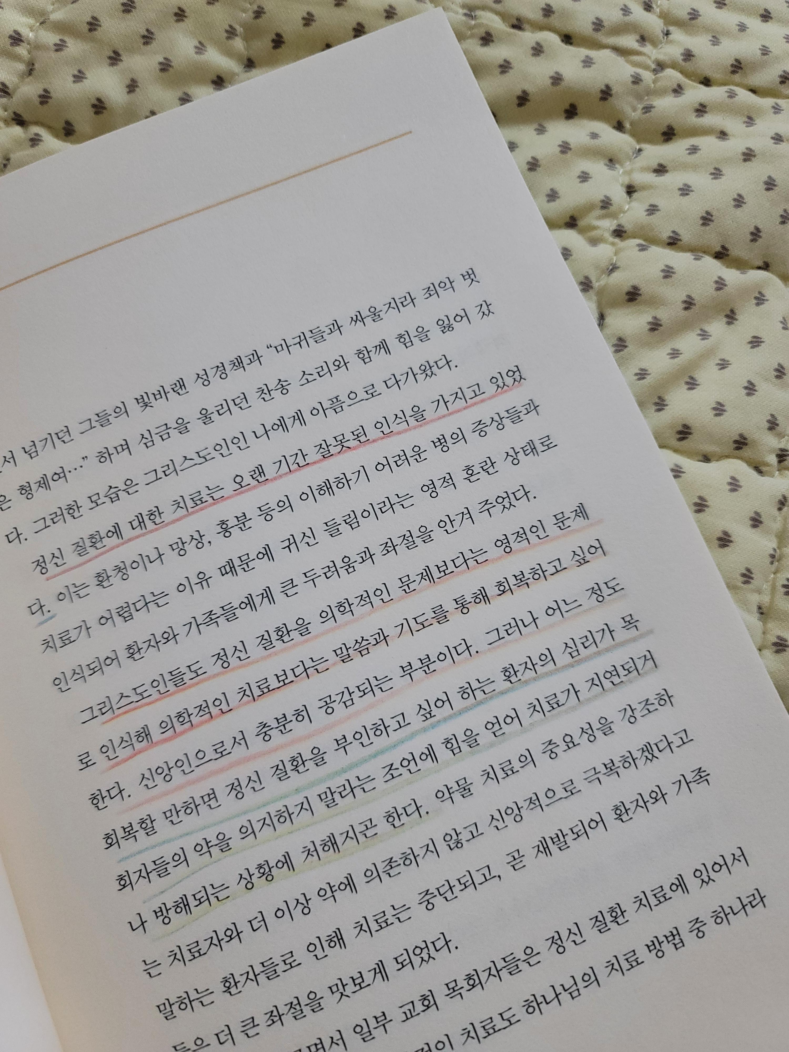 신앙이 신실하고, 믿음 생활을 열심히 하는 내 주변 이들에게도 조현병, 우울증, 공황장애가 찾아온 모습을 가깝게 접할 수 있었다. 어떤 이는 신앙으로 극복하겠다며 치료를 미뤄둔 사람도 있었고, 어떤 사람은 조기에 약물을 복용해서 상태가 호전한 모습을 볼 수 있었다. 나는 가까이에서 이러한 경험을 겪으며 마음의 병도 믿음과 치료가 함께해야만 하는 것을 절실하게 경험했다. 그래서 이 책이 어떤 이야기를 하는지 더 궁금해졌다.
