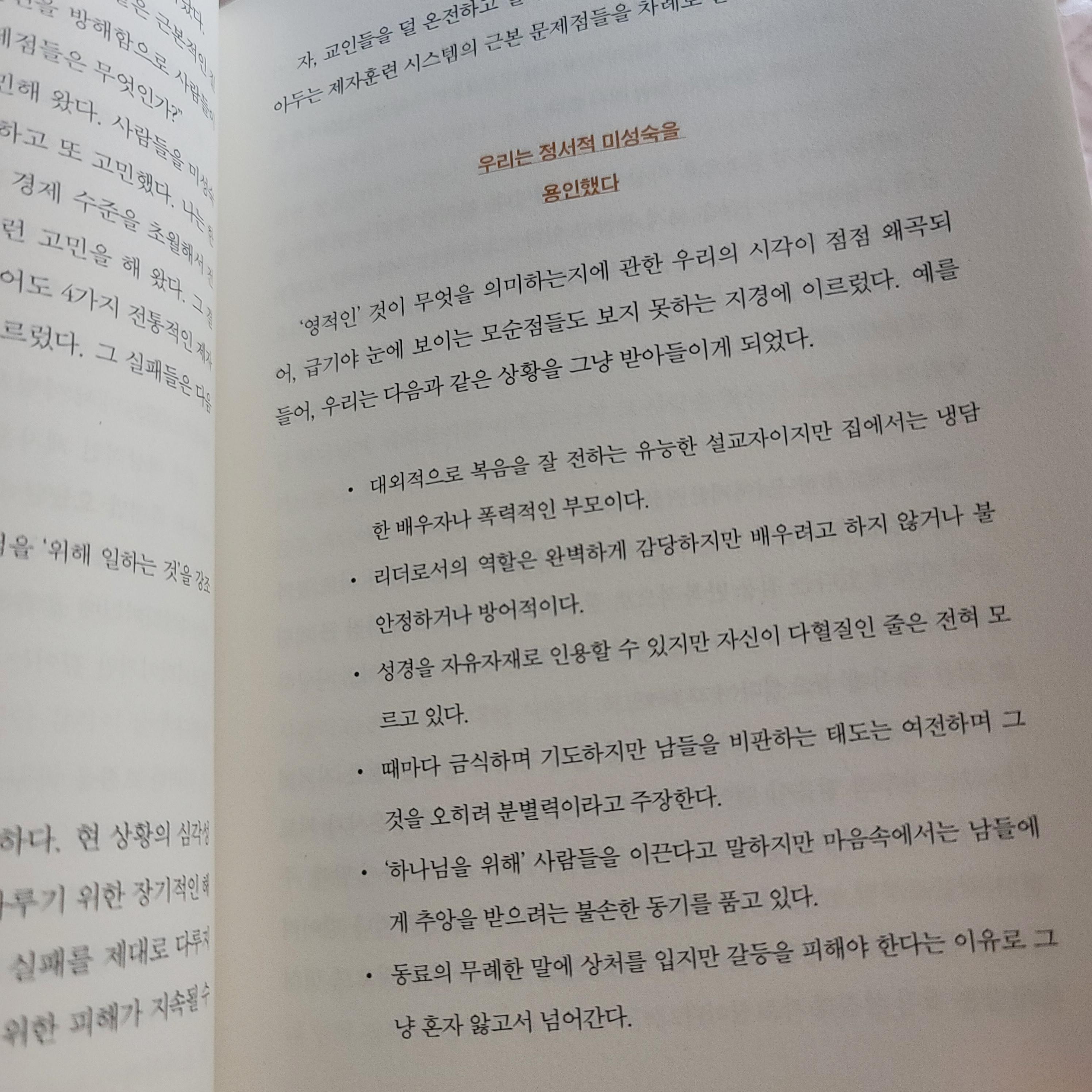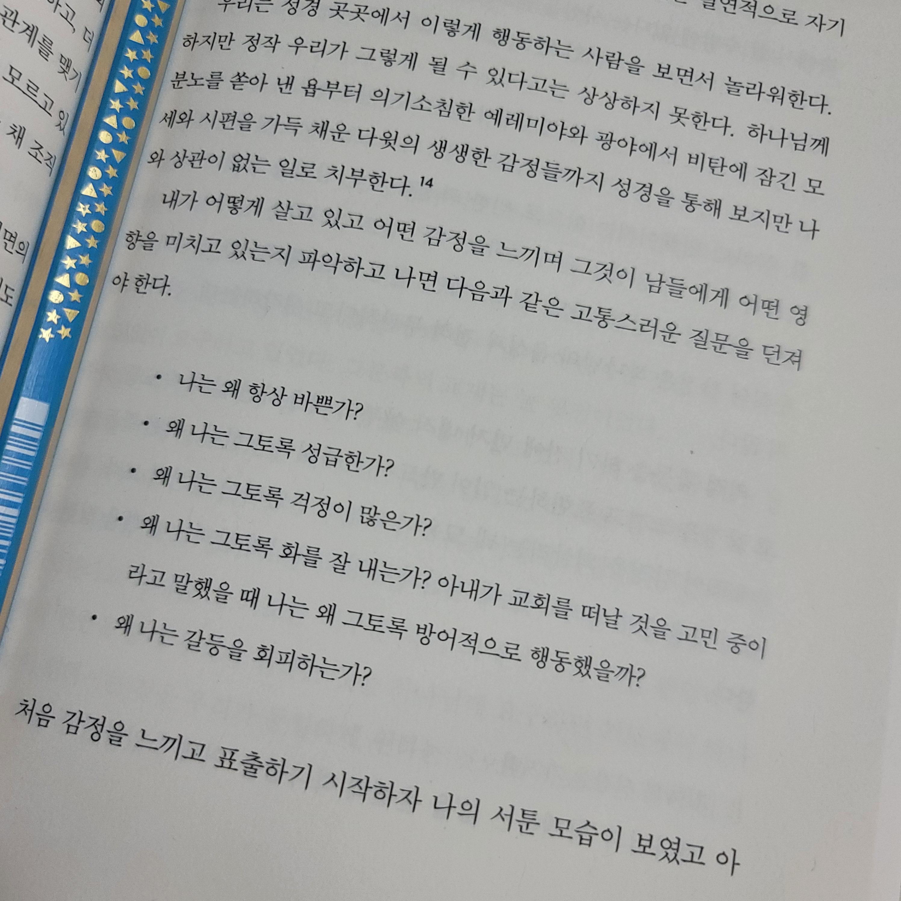정서적으로 건강한 제자훈련의 핵심은 자신을 돌아보는 것에서부터 시작한다. 변화를 꿈꾸기 위해서는 나를 바꾸는 일이 선행되어야 한다. 이 책의 영적상태 지표로 검사를 했을 때, 정서적 갓난아이와 정서적 어른의 상황중 나는 정서적 청소년의 모습은 아닐까? 하는 생각이 들었다. 성인이지만 정서적으로는 참 많이 부족한 모습이다.