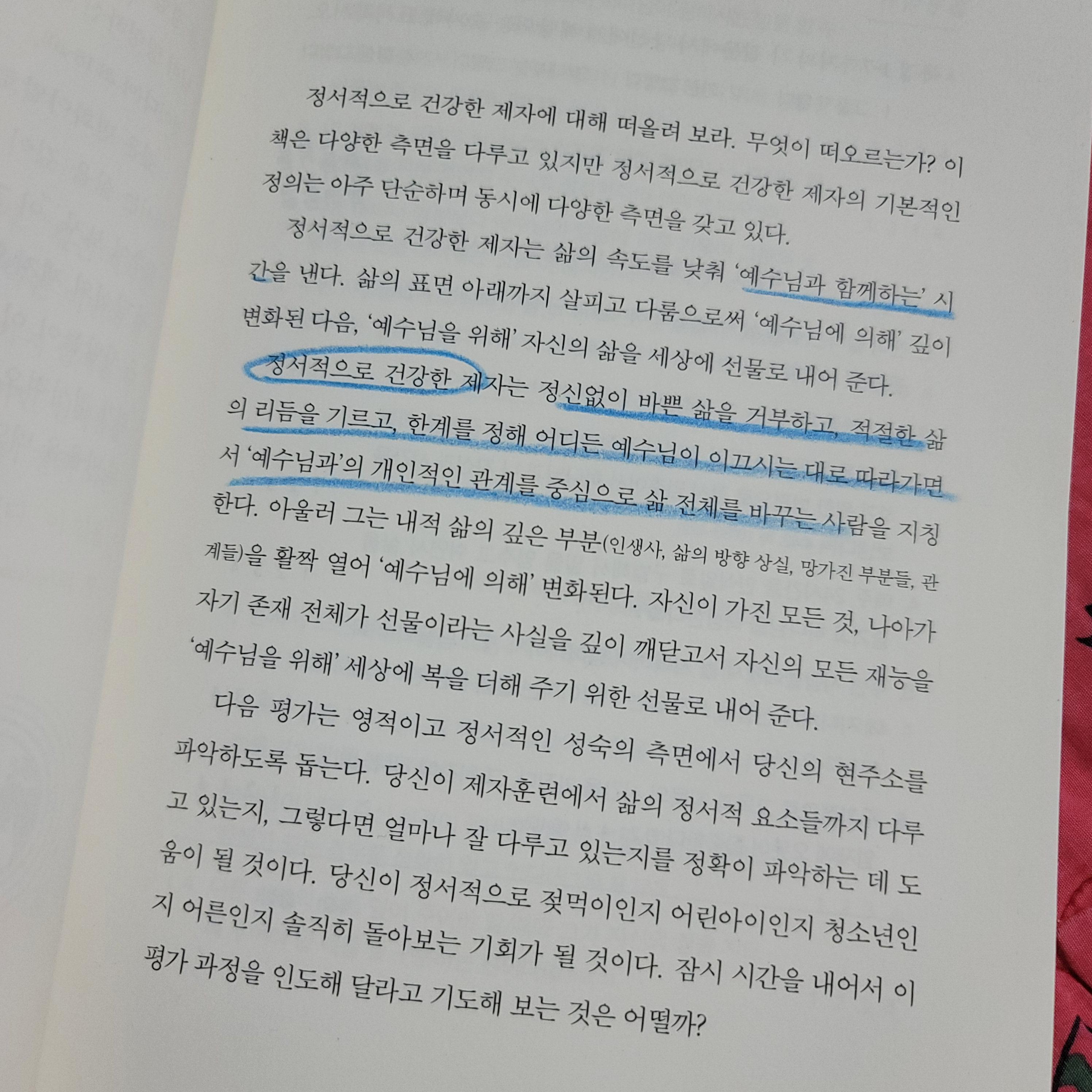 이 책은 '분노와 상처로 가득한 내 사역 앞에서'라는 프롤로그로 시작한다. 나는 길지 않은 사역의 시간들을 보냈지만 잠깐 나의 사역의 모습들을 돌아보고 있는 시기에 이 책을 만났다. 나의 사역속에도 상처들과 힘듬이 함께해왔다. 이토록 열심인데 무엇이 문제였을까? 묻는 책 앞에서 진지하게 나 또한 나의 영적 상태를 진단해야겠다는 결론이 났다. 이 책은 정서적으로 건강한 제자훈련의 7가지 특징을 말하면서 온전한 제자훈련으로 온전한 교회를 이루는 방법들을 이야기한다. 어쩌면 우리에게 너무나 당연한 이야기들 아니야? 싶지만 그 당연한 이야기를 이 책은 구체적으로, 그리고 나 자신을 위해 잘 풀어나간다는 점에서 특별하다.