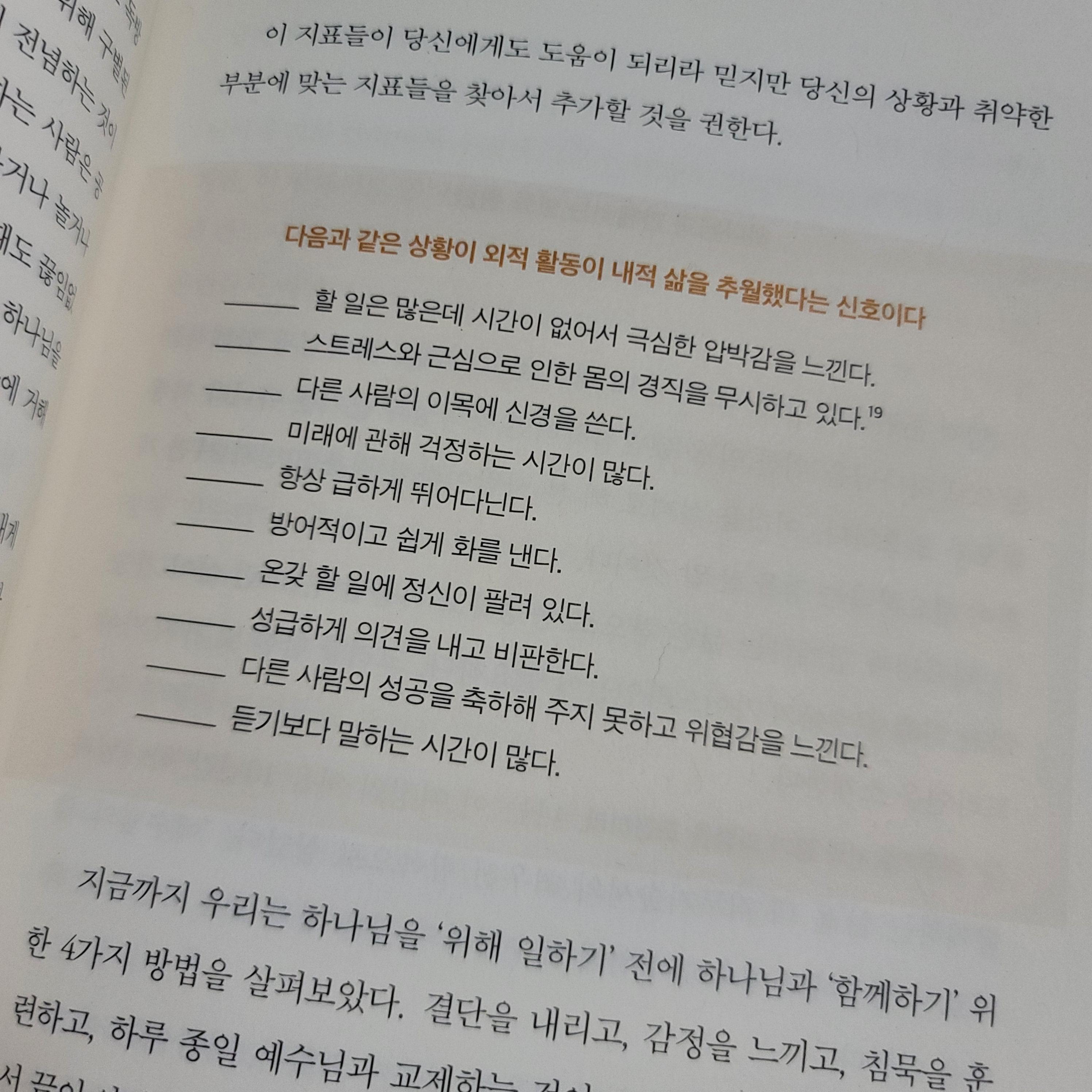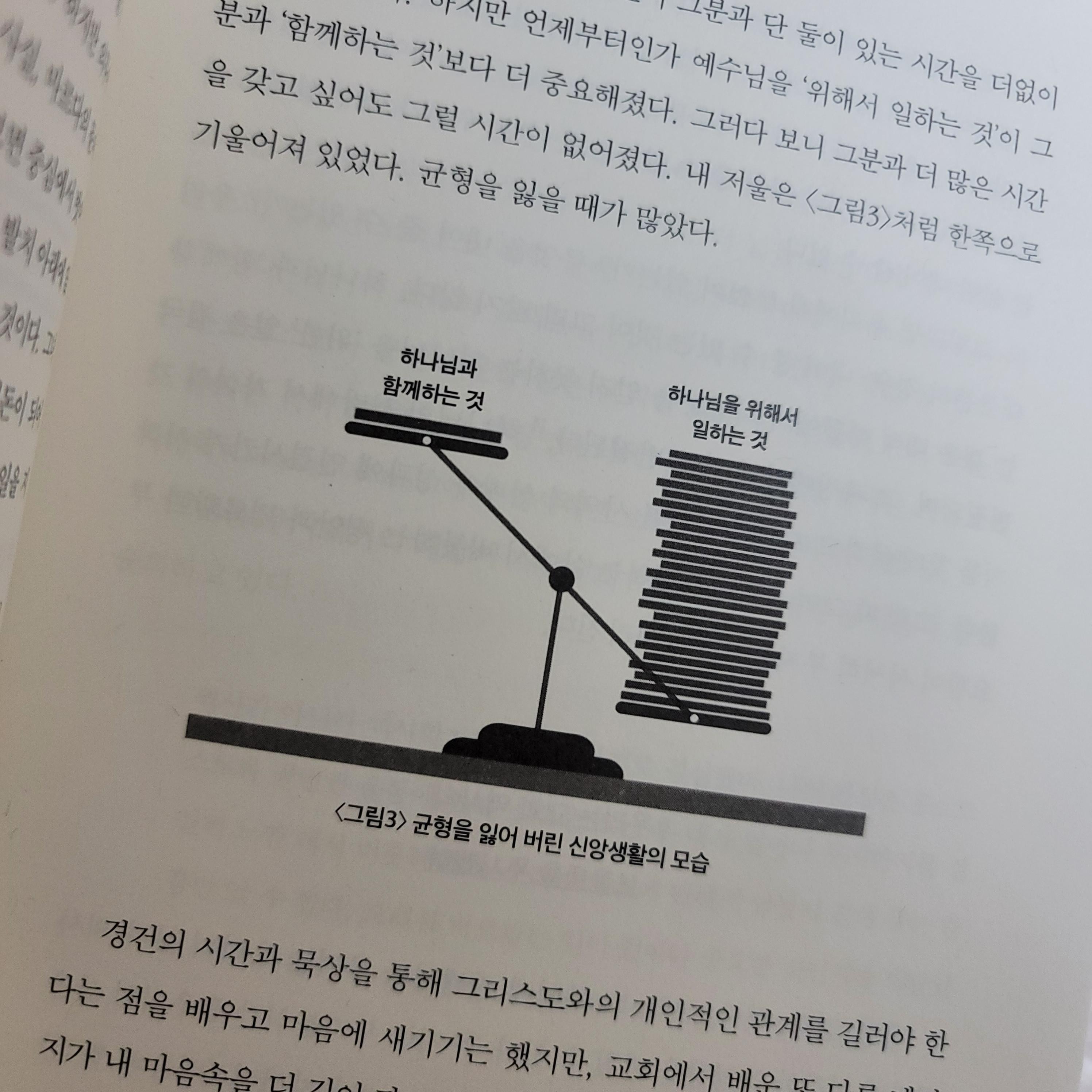 그동안은 하나님과 함께하는 것보다 하나님을 위해 일하는 것에 많은 신경과 시간과 감정을 쏟으며 지내왔다. 그러다보니 더 중요한 하나님과 함께하는 것을 놓치며 살아왔다. 방치하고 무시하며 덮어두며 지내다보니 하나님과 나와의 관계, 나의 영적인 모습과 정서들은 한꺼번에 무너져서 마음을 지키지 못하는 상황들이 불쑥 불쑥 벌어졌다. 이러한 나에게 이 책은 잠깐 멈춰서서 나를 점검하게 해주었다. 하나님을 위해 일하는 것보다 하나님과 함께하는 것이 더 중요하니, 나의 자리를 나의 우선순위를 점검하라고 책을 통해 나를 돌아보는 시간을 짧게 가지게 되었다. 이 책이 준 많은 영감들을 가지고 정신없이 바쁜 삶을 거부할 수 있는 용기 그리고 예수님과의 관계를 놓치지 않는 균형을 찾는 매일을 기대하며 예수님 안에서의 참된 쉼과 일상을 꿈꿔본다.